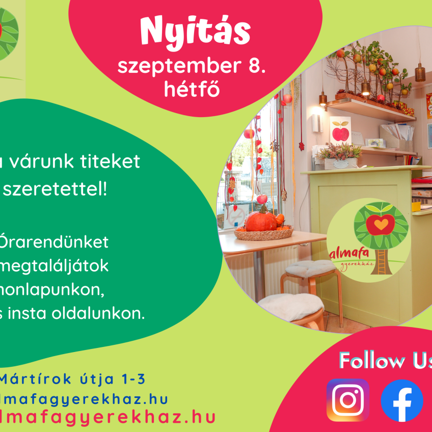 Nyitás: 2025. szeptember 8. hétfő Vannak olyan programjaink, melyek szept. 15-i héten indulnak (Almatorna, Komplex mozgásfejlesztés, ÜgyesEb). Órarendünket megtaláljátok a linkre kattintva 2025-08-20Egyéb